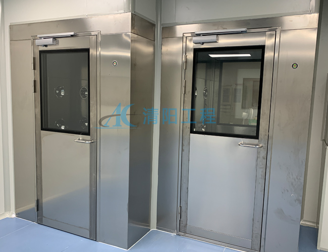 (1)是进行人/货净化和防止污染空气进入洁净区的净化通用设备,经高效过滤后的洁净空气经可旋转喷嘴从各个方向以高速度气流喷射至人/货上,从而有效迅速清除附着在其上的尘埃粒子,达到净化作用。由于两扇门不能同时开启,可起到气闸作用;