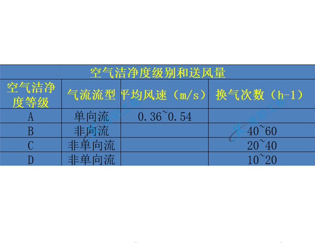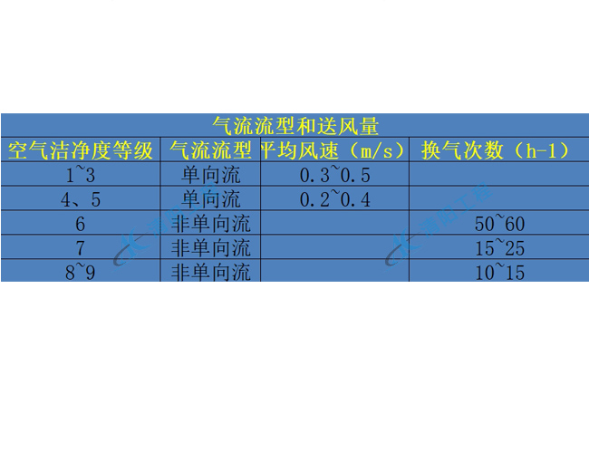 注:1)换气次数适用于层高小于4.0m的洁净室。2) 应根据室内人员、工艺设备的布置以及物料传输等情况采用上、下限值。